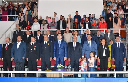 23 Nisan Kutlamaları daha sonra Kapalı Spor Salonunda Saygı Duruşu ve İstiklal Marşı’nın ardından Şiirlerin Okunması ve Halk Oyunları gösterileriyle devam etti.