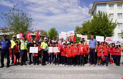 Etkinlikte öğrenciler ellerinde Türk Bayrakları ve “Yayalara