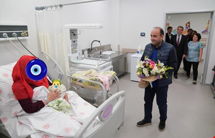 Devlet Hastanesi’nde doğan ilk bebeği ve ailesini ziyaret etti. Hayırlı olsun