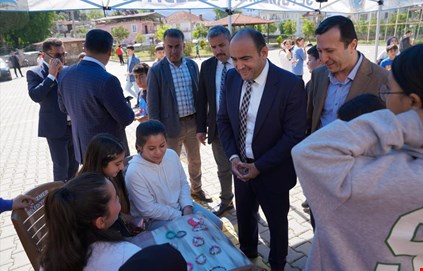 Okul bahçesinde düzenlenen kermes alanını gezerek öğrencilerle sohbet eden