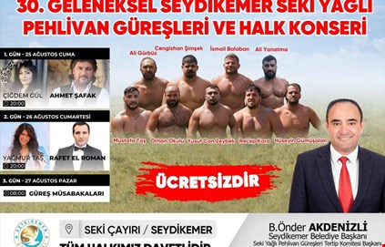 Seydikemerlileri ve tüm güreşseverleri 30. Geleneksel Seydikemer Seki Yağlı Pehlivan Güreşleri ve Halk Konserlerine davet eden Seydikemer Belediye Başkanı B. Önder Akdenizli; “Bin yıllık geçmişe sahip Ata sporumuz güreşleri ilçemizde yaşatmak ve gençlerimizi güreş sporuna teşvik etmek için çalışmalarımızı sürdürüyoruz. 27 Ağustos’ta, Tarihi Kırkpınar’ı aratmayacak ve bayram havasında gerçekleştireceğimiz etkinlikler bu yıl 3 gün sürecek. 25 Ağustos Cuma günü başlayacak etkinlikler kapsamında sevilen sanatçılar Ahmet Şafak ve Rafet El Roman bizlerle olacak ve en güzel şarkılarını Seki’de seslendirecekler. Ücretsiz olarak düzenlediğimiz Halk Konserleri ve Güreşleri’mize Seydikemerli hemşehrilerimi ve tüm güreşseverleri davet ediyorum. Etkinliğe katılacak tüm sporcularımıza başarılar diliyorum” dedi.
