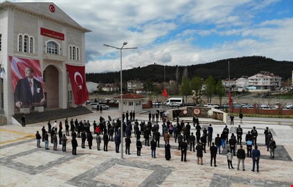 önündeki Atatürk Anıtına çelenk sunumuyla başlayan tören saygı duruşunda bulunulup,