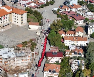 Kutlamalar kapsamında Hükümet Konağı önünden başlayan kortej yürüyüşünde, Cumhuriyet’in 102’nci yılına özel hazırlanan metrelerce uzunluktaki Türk Bayrağı öğrenciler tarafından omuzlarda taşındı.