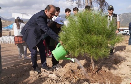 ve protokol üyeleri öğrencilerle birlikte fidan dikip, ilk can sularını