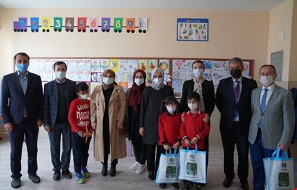 hediye paketlerini öğrencilere teslim etti. Kaymakam Büyüker, Belediye Başkan